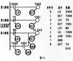 第3梯級;左邊第一個觸點為常閉,上標為M0, M為輔助繼電器(該繼電器有多種,注意類別),其指令的正確表示應為:4、LDI  M0(如程序所示)。本梯級的第2行第一個觸點為常開,上標為Y000,Y表示輸出繼電器,由于該觸點與后面Y001觸點呈串聯關系,形成了所謂的電路"塊",故而其觸點的指令應為 5、LD  Y000。總之LD與LDI指令從上面可以看出,它們均是左母線每一梯級第一觸點所使用的指令。而梯級中的支路(即第3梯級的第2行)有二個或二個以上觸點呈串聯關系,其第一觸點同樣按LD或LDI指令??墒褂肔D、LDI指令的元件有:輸入繼電器X、輸出繼電器Y、輔助繼電器M、定時器T、計數器C、狀態繼電器S。OUT為線圈驅動指令,該指令不能出現在左母線第一位。驅動線圈與驅動線圈不能串聯,但可并聯。同一驅動線圈只能出現一次,并安排在每一梯級的最后一位。如上圖中的1、OUT  Y000,3、OUT  Y001,Y為輸出繼電器,其線圈一旦接獲輸出信號,可以這樣認為,線圈將驅動其相應的觸點而接通外部負載(外部負載多為接觸器、中間繼電器等)。而上圖8、OUT  T0  K40 為定時器驅動線圈指令,其中的K為常數40為設定值(類似電工對時間繼電器的整定)。可使用OUT指令元件有:輸出繼電器Y、輔助繼電器M、定時器T、計數器C、狀態繼電器S。