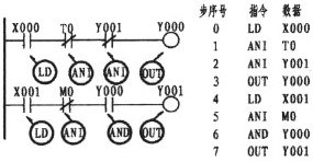 由第1梯級來看;X000、T0、Y001三觸點成串聯關系,即T0的常閉串接于X000的后端,而Y001的常閉則串接于T0常閉的后端。由于都是常閉故用ANI指令。現來看第2梯級;X000、M0、Y001,同樣三觸點也是串聯關系,M0的常閉接點串接于X001的后端,而Y000的常開接點則串接于M0的后端。故M0的指令用ANI,而Y000的指令則用AND(具體編程詳上圖),一句話只要是串聯后面是常開的用AND,是常閉的則用ANI??墒褂肁ND、ANI指令元件有:輸入繼電器X、輸出繼電器Y、輔助繼電器M、定時器T、計數器C、狀態繼電器S。