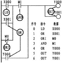 可以看出上圖的X000、X001、M0三者處于并聯關系。由于X000下面二條支路均為單個觸點,因X001是常開觸點,故用OR指令。而M0是常閉觸點,則用ORI指令。三接點并聯后又與M1串聯,串聯后又與Y000并聯,而Y000也是單個觸點,所以仍采用OR指令。可使用OR、ORI指令元件有:輸入繼電器X、輸出繼電器Y、輔助繼電器M、定時器T、計數器C、狀態繼電器S。