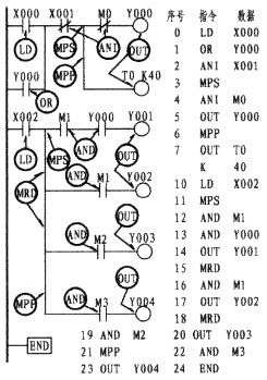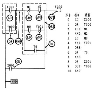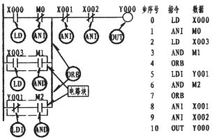 由上圖可以看出,第一支路X003的常開觸點與M1的常開觸點成串聯關系(在這樣的情況下,形成了塊的關系),它是與上一行的X000與M0串聯后相并聯,此時程序的編寫,如步序號0、1、2、3、4所示。4所出現的第一個ORB指的是與上一行并。而第二支路,常閉Y001與M2同樣是串聯關系。也是一個塊結構,其串聯后再與第一支路并。故步序7再次出現ORB。ORB指令并無梯形圖與數據的顯示??梢赃@樣認為;它是下一行形成電路塊的情況下與上一行并聯的一條垂直直線(如圖中所示的二條粗線)。