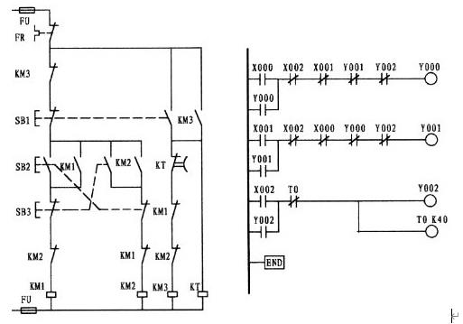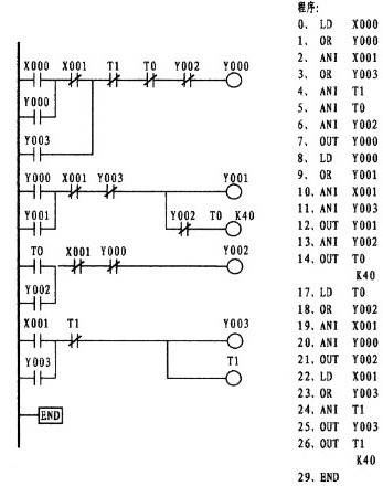 程序:0、LD   X000  1、OR   Y000   2、ANI   X002    3、ANI   X001   4、ANI   Y001   5、ANI   Y002    6、OUT  Y000    7、LD   X001    8、OR   Y001   9、ANI   X002   10、ANI   X000   11、ANI  Y000   12、ANI   Y002    13、OUT   Y001   14、LD  X002 15 、OR  Y002   16、ANI  T0    17、OUT   Y002    18、OUT  T0   K  40  21、END