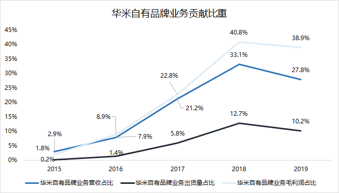 在頂峰的2018年,華米自有品牌以12.7%的出貨量占比貢獻(xiàn)了超過三成營收與四成毛利潤。