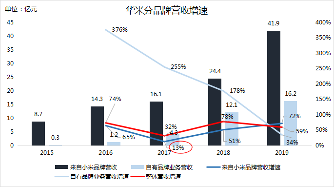 在招股書及年報(bào)中,華米會(huì)將營收按品牌來源劃分為來自小米品牌與來自自有品牌業(yè)務(wù)兩部分。