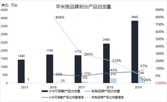 2019年,華米Amazfit出貨量與自有品牌業(yè)務(wù)營收增速分別為26%與34%,相較2018年大幅放緩,也不及來自小米品牌的出貨量、營收增速。